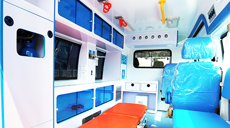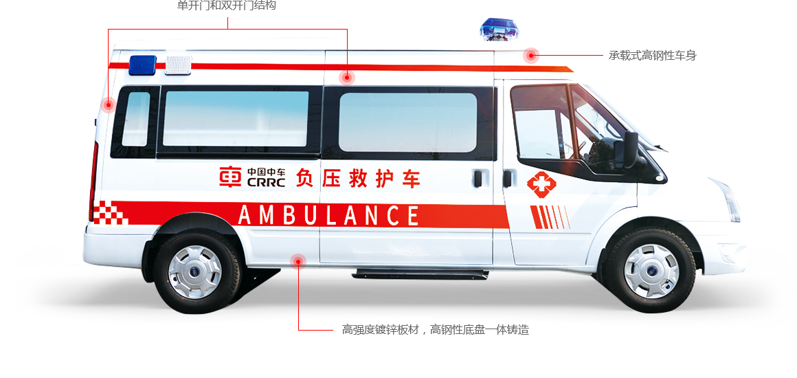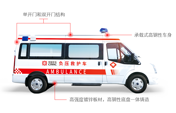 The self-supporting high-rigid car body is casted by high-strength galvanized sheet and high-rigid chassis as a whole. The level of safety performance is high. The vehicle body is equipped with single-door and double-door structures to facilitate the access of personnel and the transfer of patients.